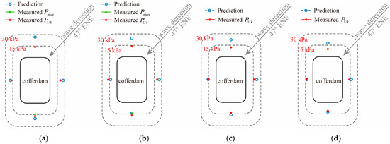 For comparing the wave pressures of TDBEM with the on-site measurement, according to some existed studies [29,30,31], the prediction conditions consisting of the measured wave height indicator and the corresponding period are specified as and , and , and , and . The wave height and corresponding period has been introduced in Section 2.2. Among those , is to evaluate the wave pressure caused by the greatest part of waves. , i.e., the significant wave height, is selected to evaluate the significant pressure like the common analysis. For more comparison data to discuss the differences between the prediction and the measurement, the wave height between and is also selected for supplementing the prediction.