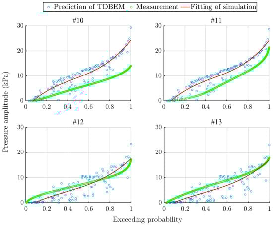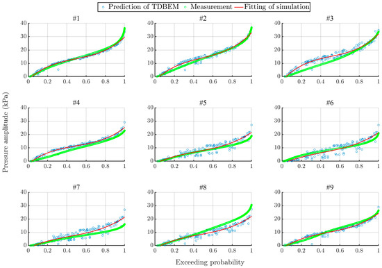 For the discussion, the horizontal axis is assigned to the exceeding probability and the vertical is the pressure amplitude. Each subplot illustrates the comparison at each transducer location. The green scatter plot shows the probability distribution of the measured wave pressure amplitude, while the blue shows the predicted probability distribution which is fitted by the red line. In the comparison at the altitude of −2.37 m, as shown in Figure 13, the error mainly occurs in the low-exceeding-probability range of the transducers located in the up-wave side, i.e., the results of #2–#4 whose predictions are greater than the measurements. While in the down-wave side, the error mainly occurs in the high-exceeding-probability range, such as #7 and #8, among which the prediction of #7 is greater than the measurement while it is contrary for #8. At the altitude of −6.37 m, the predictions in the up-wave side are greater than the measurements as shown in results of #10 and #11, while the predictions in the down-wave side are relatively lower than the measurements over the low-exceeding-probability range, as shown in results of #11 and #12. In addition, with increasing the water sinking depth, the margin of error in the comparison is increased, particularly for the up-wave side, which accounts for the large bias occurred in the previous comparison of pressure spatial distribution.