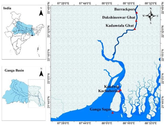 Geographic distribution of sampling sites along the Hooghly River estuary. Red triangles indicate the location of six sampling stations from Barrackpore to the confluence at Gangasagar (Bay of Bengal).