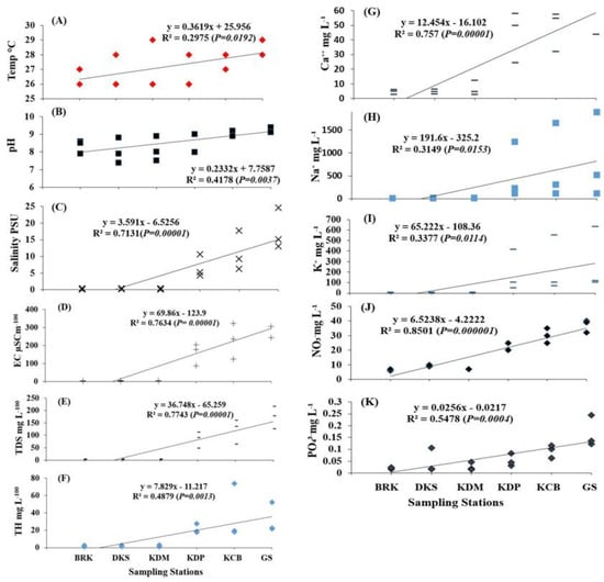 Seaward trends of selected physical parameters estimated for the present study at six sampling sites (Table 1) during October 2017, February 2018, and June 2018, including (A) temperature, (B) pH, (C) salinity, (D) electrical conductivity, (E) total dissolved solids, (F) total hardness, (G) calcium, (H) sodium, (I) potassium, (J) nitrate, and (K) phosphate.