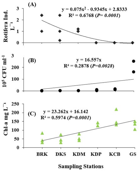 All the estimated abiotic (Figure 2) and biotic (Figure 3) parameters except DO level, rotifer (Figure 3B), and cladoceran abundance, showed significant seaward increase; in contrast, the rotifer abundance showed a significantly seaward decreasing trend (R2 = 0.6; p < 0.0001).