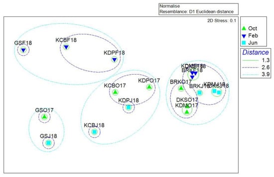 To elicit variations at spatio-temporal scales, the similarities of community composition among the sampling stations for each sampling date and also among sampling dates were compared. We first determined the centroid vector that represents the average composition of the group/species. Spatial heterogeneity was estimated using the mean and standard deviation of the similarities from the estimated similarity vector. We calculated the Bray–Curtis index to characterize the dissimilarities between samples (β-diversity). Square-root-transformed species abundance data were used for constructing the Bray–Curtis matrix of dissimilarity with average linkages group classification [79]. As the Bray–Curtis similarity mixes the differences due to species losses and species turnover, we also partitioned this index to understand both components of dissimilarity. For abiotic parameters, the distance between two samples was measured by Euclidean distance (ED), as ED is more appropriate for a low-dimensional data set [79].