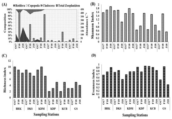 Percent (%) composition of Rotifera, Cladocera, Copepoda, and total zooplankton abundance (L−1) (A), Shannon–Wiener index of diversity (B), species richness (C), and Simpson index for evenness (D) of zooplankton, recorded during October 2017, February 2018, and June 2018 at six selected stations in the HRE.