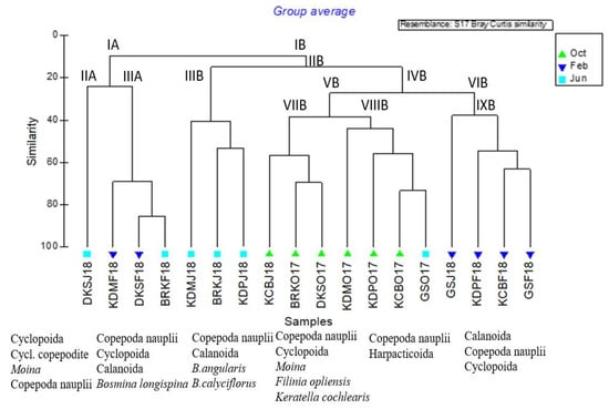 The heterogeneity at the spatial scale was estimated by the Bray–Curtis similarity matrix, which was observed to be higher than the heterogeneity at the temporal scale (Figure 6). It shows that the average similarity between all sampling dates was higher than the average similarity between the stations on a single sampling date. The cluster analysis gives further insights into the relative role of seawater and freshwater in shaping the community structure and segregate stations accordingly (Figure 6). The first hierarchical level separates the June samples of DKS and KDM and February samples of the two uppermost stations (BRK and DKS) from the remaining samples at 90% dissimilarity, from which June samples of DKS were separated at the second hierarchical level at 75% dissimilarity. June samples of DKS mainly represented the Cyclopoida adults, copepodites, and the Cladocera Moina macrocopa, whereas February samples of upper two stations and June samples of KDM grouped together and represented copepod nauplii, cyclopoids, and calanoids. The June samples of BRK, KDP, and KCB grouped together and separated at the third hierarchical level, whereas the February samples of all the estuarine and lowermost riverine (KDM) stations grouped together and separated at the fourth hierarchical level. Samples collected in February 2018 at the three estuarine stations and the lower most riverine (KDM) station grouped together and separated from remaining samples at the hierarchical level V (VIIB). The highly indicative zooplankton of cluster VIIIB are copepod nauplii and harpacticoids (Figure 6). This cluster clearly indicates further upward intrusion of the marine community in February. All the October samples aggregated at intermediate position and showed clear separation of riverine and estuarine stations (Figure 6). October samples showed distinct spatial variations, where riverine samples were separated from estuarine samples at the fifth hierarchical level, and the June samples of GS (estuarine mouth) joined this cluster (Figure 6).