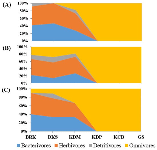 Percent (%) composition of zooplankton trophic guild at six sampling stations during October 2017 (A), February 2018 (B), and June 2018 (C) in the HRE.