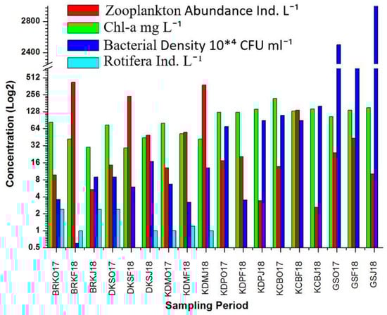 Zooplankton samples were collected by making surface tows (0–20 cm) with a customized plankton net with 53 μm mesh size, 0.25 m mouth diameter, and preserved in 4% (w/v) buffered formalin immediately after collection in a 100 mL transparent bottle. At each site, 100 L water was filtered in five replicates. In the laboratory, the plastic bottles containing preserved zooplankton were thoroughly mixed, and a 1 mL subsample was drawn with a fine pipette to a Sedgwick–Rafter plankton counting cell for enumeration under the compound microscope (model no: Olympus CX21LED, Bartlett, TN, USA). The numbers per liter of each genus was quantified and calculated using the following formula: