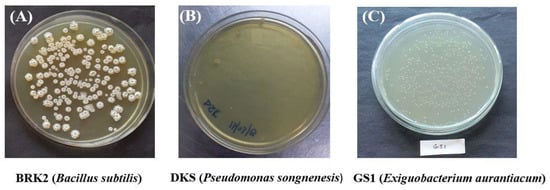 DNA from the bacterial culture—BRK2, DKS, and GS1 strains—was isolated using the bacterial gDNA isolation kit (XcelGen, Gujarat, India). Isolation of DNA was carried out according to manufacturer’s instructions. First, 1.2% agarose gel was used to evaluate the quality of isolated DNA, and a single band of high-molecular band of the PCR amplicon was detected (Figure S1). Amplification of isolated DNA was performed with 16S rRNA-specific primer (8F and 1492R) using Veriti® 96 well thermal cycler (Model No. 9902, Thermo Fisher Scientific, Waltham, MA, USA). Sanger sequencing was performed using BDT v3.1 Cycle sequencing kit with M13F and M13R primers on ABI 3730xl Genetic Analyzer was performed after the PCR amplicon was enzymatically purified. A consensus sequence of 1284, 1465 bp, and 1487 of 16S rRNA was generated by using aligner software from forward- and reverse-sequence data. The consensus sequence of all the three strains, accession numbers, and origin are shown as Table S1. All nucleotide sequences were deposited at the National Center for Biotechnology Information (NCBI) strain library with accession numbers provided in (Table S1).