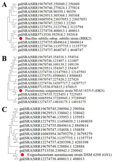 Phylogenetic analysis of Bacillus subtilis (A), Pseudomonas songnenensis (B), and Exiguobacterium aurantiacum (C) with their twelve different orthologues, isolated from three selected sampling stations (BRK, DKS, and GS) in the HRE.