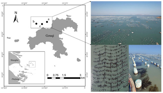 Gouqi Island (30°41′–30°44′ N, 122°44′–122°48′ E), which is part of the Maan Islands, Zhoushan Archipelago, is rich in marine fishery resources, and a large biomass of S. horneri is present around the island reefs [29]. The waters around the island represent one of the largest mussel aquaculture areas in China, with an area of over 6.6 km2, and a large number of S. horneri are attached to the aquaculture rafts. Macroalgal samples were collected every month from August 2021 to July 2022 (before the outbreak of the local golden tides) in the mussel culture area of Houtou Bay and Gouqi Island, and their growth status was monitored. As shown in Figure 1, three sampling points, namely A (30°43′40″, 122°45′51″), B (30°43′52”, 122°45′4″), and C (30°43′48″, 122°44′56″), were randomly set, and 30 samples were randomly collected from different culture cables each time.