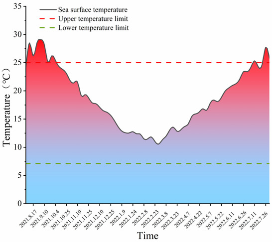 Gouqi Island is located in the East China Sea at the mouth of the Yangtze River and is affected by both the Taiwan warm current and the freshwater input from the Yangtze River Estuary. Figure 2 shows water temperature variation throughout the monitoring period (2021–2022): from August to September 2021, the SST near Gouqi Island ranged from 24 to 29 °C, and the average temperature exceeded the biological upper limit for S. horneri, reaching 26.8 °C; from October 2021, SST began to decrease, with the average dropping from 23.2 °C to 11 °C, and was the lowest in February 2022, with a variation range of 12–10 °C; from March 2022, it increased again, with the monthly average temperature reaching approximately 14 °C (Figure 2).