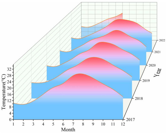 Figure 3 shows the variation in SST in the waters near Gouqi Island from 2017 to 2022 and indicates that this parameter increased each year during the winter period from December to February of the following year. The mean SST in December 2017 increased from 14.5 °C to 16.2 °C, and the temperatures in January and February of the following year increased from 10.5–9 °C to 12.7–11.5 °C, respectively. On average, the interannual monthly temperature increased by 2–3 °C, and the warm winter phenomenon became more and more obvious. The SST in winter and spring gradually increased every year; in March and April 2022, it increased from 11–16 °C to 14–17 °C, and in April 2022, the SST rose by about 1–2 °C.