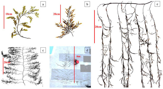 Morphological characteristics of S. horneri in the aquaculture area across seasons: (a) summer; (b) autumn; (c) winter; (d) spring; and (e) after March 2022.