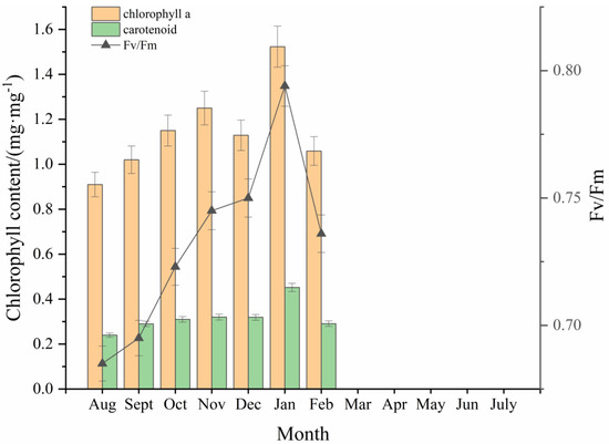 From August to November 2021, the contents of chlorophyll a and carotenoids in the blades of attached S. horneri slowly increased; the former increased from 0.9 mg·mg−1 to 1.2 mg·mg−1, while the latter did not increase significantly and remained at about 0.3 mg·mg−1 (Figure 5). In December, chlorophyll a content decreased to 1.1 mg·mg−1, while carotenoids did not change significantly. In January 2022, both parameters increased significantly to 1.5 mg·mg−1 and approximately 0.5 mg·mg−1, respectively. In February 2022, the variation in chlorophyll content showed a downward trend again. The Fv/Fm value was relatively low from August to September 2021, ranging from 0.65 to 0.7, and it increased significantly to 0.75 from October to December. In January 2022, it further increased significantly to a maximum of 0.8 and decreased to 0.74 in January 2022. Due to the deterioration of algae in a large section of the aquaculture area in March 2022, the leaves detached from the rafts, and no samples could be collected for the determination of chlorophyll content and chlorophyll fluorescence parameters (Fv/Fm) after that month.