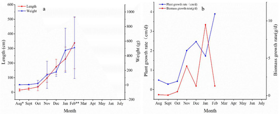 Monthly variation in the plant length and individual biomass of S. horneri in the aquaculture area; (a) monthly variation in plant length and biomass; (b) rate of length and biomass variation. * Appearance of vesicles; ** appearance of receptacle.
