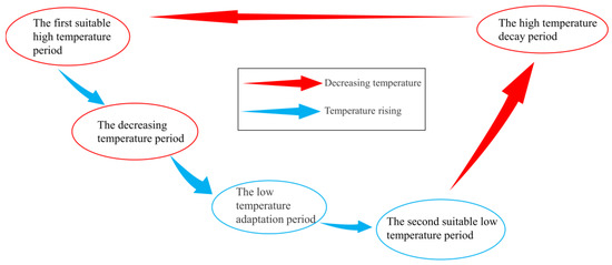 Taxonomically, S. horneri can be divided into the “spring mature” and “autumn mature” types [35,36,37]. The former could be identified in the study area based on the algae’s reproductive characteristics and previous studies on attached S. horneri conducted in the local aquaculture area [10]. Based on the characteristics of algal growth and development and on the observed variations in SST, plant length, and individual biomass, the growth of attached S. horneri in the aquaculture area of Gouqi Island can be divided into five stages: (1) the first suitable high-temperature period (August to December), (2) the decreasing temperature period (October to November), (3) the low-temperature adaptation period (December), (4) the second suitable low-temperature period (January to February), and (5) the high-temperature decay period (February to May) (Figure 8).