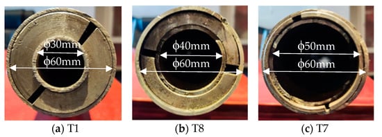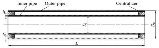 To investigate the influence of parameters such as pipe diameter and pipe wall thickness, 10 specimens were considered in this experimental test, as shown in Table 1. The effect of outer pipe diameter was studied in T1 to T3, the effect of outer pipe wall thickness was studied in T4 to T6, the effect of inner pipe diameter was studied in T1, T7, and T8, and the effect of inner pipe wall thickness was studied in groups T6, T9, and T10.