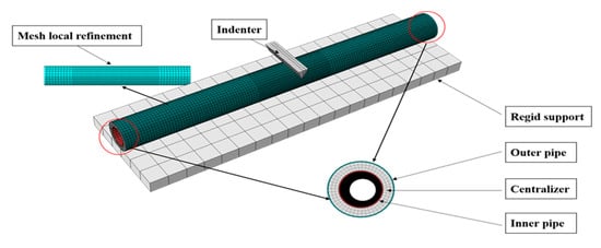 At present, the research on the damage of pipelines by external objects is mostly carried out through methods of experiment and finite elements [12,13,14,15,16,17,18,19,20,21]. Experiments and finite element models have been used to study the behavior of the concave pipe under external pressure [22]. Indentation tests were performed under both quasistatic and dynamic conditions on a 12-inch diameter pipe, and the finite element models for this problem were established and compared with the experimental results [23]. The performance of the preloaded pipeline under local lateral load was studied through tests, and the related finite element simulations and theoretical predictions were carried out [24]. Based on the existing test data, the finite element models of single-layer pipe and PIP were established, to study the influence of external pressure on the relationship between lateral load and local indentation [25]. A two-stage method was proposed to predict the relationship between lateral load and local indentation of the pipe structure filled with cement composite by experimental and finite element methods [26]. The influence of the dimensions of pre-existing corrosion and dent defects on the transverse impact behavior of PIP after service time was experimentally and numerically investigated [27]. A theoretical model is proposed to predict the indentation of PIP by evaluating three stages of PIP indentation [28]. In these studies, most of the pipe ends can rotate freely, which complies with the rotating free boundary condition of the PIP.