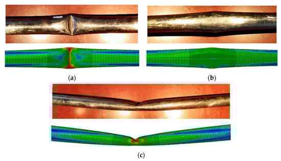 Comparison of deformation by test and numerical simulation for T1: (a) upper surface, (b) lower surface, and (c) side surface.