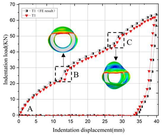 The finite element result (black square symbol) and test result (red triangle symbol) for T1 are illustrated in Figure 7. It can be seen that three phases were separated by two critical points B and C during the deformation process, which makes the deformation mechanism of PIP quite different from that of the single-layer pipe. In the first stage (A-B), the upper outer pipe had no contact with the upper inner pipe, and the PIP resisted external forces mainly through the outer pipe while the inner pipe did not deform. In the second stage (B-C), the upper outer pipe made contact with the upper inner pipe, while the lower inner pipe had not touched the lower outer pipe. The PIP resisted external forces by the combined action of the outer and inner pipe, with the difference being that the outer pipe was a rigid support while the inner pipe was a cantilever support. In the third stage (C-D), the lower inner pipe made contact with the lower outer pipe, the PIP resisted external forces by the combined action of the outer and inner pipes under rigid support. The deformation mechanism of PIP is different from that of the single-layer pipe due to the interaction between the outer and inner pipes of PIP during the deformation process. The PIP resisted external forces mainly through the outer pipe under rigid support in stage 1, so it is feasible to simplify the PIP as a single-layer pipe; the PIP resisted external forces mainly through the combined action of the outer and inner pipes in stage 2 and stage 3. The outer pipe resists the external force in the case of rigid support, and the inner pipe resists the external force in the form of a cantilever pipe in stage 2. The outer and inner pipes resist external forces under rigid support in stage 3.
