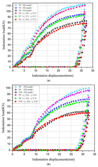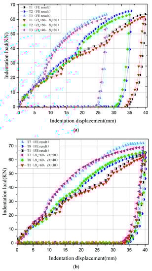 The effects of the diameter and wall thickness of inner and outer pipes on the relationship between the indentation load and lateral indentation of the PIP are studied in this section. The influences of outer pipe diameter (Do) and inner pipe diameter (Di) on the load–deformation relationship are shown in Figure 8; the influences of outer pipe wall thickness (to) and inner pipe wall thickness (ti) on the load–deformation relationship are shown in Figure 9. It was found that all of the trends obtained from the numerical simulation for the different specimens showed reasonable consistency with the results measured from the model tests.