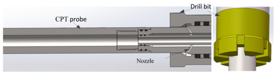 The cross-sectional area of the probe is considerably smaller than that of the drill bit, resulting in a lower soil resistance for the probe compared to the drill bit. In certain instances, the probe can penetrate under a specific amount of force, while the drill bit is unable to continue moving downward, halting the CPT. To address this issue, the drilling rig drives the drill bit to rotate, therefore reducing the frictional resistance of the soil [17]. During drill-bit rotation, seawater flushing is necessary to prevent burning or clogging [18]. However, the flow noise generated by seawater flushing propagates along the drill pipe and the detection signal, distorting the received signal. To enhance the accuracy of the received signal, it is essential to understand the flow-noise characteristics of the drill bit and suppress them effectively.