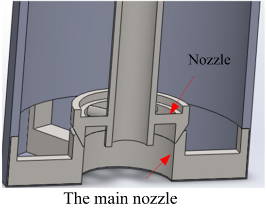 A structural diagram of the CPT bit part based on the submarine drilling rig is shown in Figure 1. It mainly consists of two parts: the drill-bit assembly and the CPT probe. The probe is at the center of the drill bit, is independent of the drill bit, and has no influence on the distribution of the flow field; therefore, it can be disregarded in the next analysis. The high-pressure seawater first flows into the main nozzle of the drill bit through the nozzle, then rotates in the main nozzle of the drill bit with the rotation of the bit, and finally returns through the hole wall of the bit. According to the fluid flow at the drill-bit position, a sectional view of the established three-dimensional flow field is shown in Figure 2. The flow-field grid of the calculation model can be installed according to the three-dimensional diagram of the flow channel of the cone penetration drill bit. These meshes were generated using ANSYS ICEM CFD mesh generation software (ICEM CFD 18.0), as shown in Figure 3. The flow field of the drill bit is divided by a tetrahedral mesh, and the mesh density is increased at the nozzle of the drill bit to meet the calculation requirements. The medium in the flow field is seawater, its density is 1050 kg/m3, the propagation velocity of sound waves in water is 1500 m/s, the reference sound power is 10−12 W, the k-epsilon turbulence model is used, the inlet velocity and outlet pressure are set as 5 m/s and 2 MPa, respectively, the wall roughness is 0.0032 mm.
