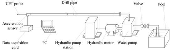 The oceans are a treasure trove of mineral resources that can be used to support the survival and development of humankind [1]. With the rapid development of the construction of marine engineering facilities, marine geological surveys have become particularly important [2]. Determining the basic physical parameters of the seabed soil, foundation bearing capacity, soil layer, and soil class division, as well as judging the possibility of soil liquefaction, is an important basic work in the development and use of marine resources. Because of the special nature of marine geology, it is difficult to maintain the stress state and nature of the soil in its original state with on-site sampling [3,4]. CPT has the advantage of being fast and accurate compared with seabed sampling and analysis [5,6]. It uses special equipment with a sensor probe that penetrates according to a certain speed pressure into the seabed soil layer and uses the probe’s detected data to ascertain the seabed soil’s physical and mechanical properties. It is an indispensable and important technical means of seabed geotechnical investigation for seabed resource exploration, seabed military, and civilian engineering construction, and the deployment of seabed engineering equipment [7,8]. Subsea CPT equipment can be classified into three basic types according to their working modes: platform, seabed, and downhole [9]. Seabed CPT has certain advantages over the other two modes of operation. First, the cost is relatively low, and general survey vessels can carry it without the need for a specific drillship; second, it is easy to use and can be stowed and released by the aft A-frame, side crane, or midship moon pool. It can obtain real-time data by operating through the deck unit, saving time and cost. Furthermore, the seabed CPT can spatially ensure the integrity of the touchdown path [10]. In particular, the CPT based on the submarine drilling rig is a new type of seabed-type CPT method that overcomes the shortcomings of ordinary seabed-type CPT with shallow testing depth. It is an important direction for developing subsea CPT at present [9,11]. When employing a submarine drilling rig for CPT, the drilling rig provides the downward penetration driving force to the probe. The data collected by the probe are transmitted to the receiver on the drilling rig via sound waves through the drill pipe and subsequently transferred to the support vessel through the armored umbilical cable on the drilling rig [12,13].