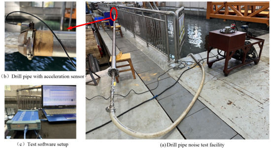 The flow-noise characteristics of the bit at a specific flow rate can be measured by placing the drill pipe on the support and installing an acceleration sensor at the bit, as shown in Figure 5b. The plunger pump and hydraulic motor are immersed in the tank, and the hydraulic pump station is started so that the hydraulic motor drives the plunger pump to flush the drill pipe. The pipe was filled with water for more than 3 min to eliminate bubbles in the drill pipe.