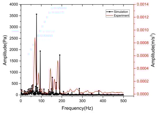 The analysis bandwidth of the collector was set as 0-500 Hz, and the corresponding sampling frequency was set to 5000 Hz by the Nyquist law, with a sampling time of 10 s. The time-domain signal was processed by fast Fourier transform (FFT) to obtain the amplitude of the corresponding conditions. The obtained spectral diagram of the experimental flow noise was compared with the simulation data under the same conditions, as shown in Figure 6. The results show that the simulation results are consistent with the experimental results. When the frequencies are around 77 Hz, 95 Hz, 154 Hz, 172 Hz, and 192 Hz, the experiment and simulation noise peaks appear simultaneously, which shows the correctness of the simulation theory and model adopted in this paper.