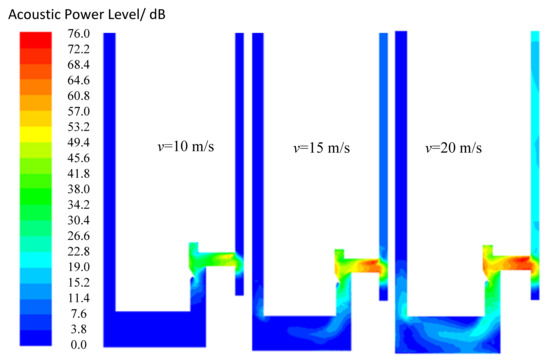 When the inlet velocity increases from 10 to 20 m/s, the static pressure, flow velocity, and noise distribution on the middle cross-section are shown in Figure 7, Figure 8 and Figure 9, respectively. The static pressure near the hole presents a noticeable gradient. Because of the pressure difference, the fluid in the high-pressure area will move to the liquid in the low-pressure zone. When the low-and high-pressure fluids meet, an impact is bound to occur, which will lead to flow noise. This is well demonstrated in the noise profile in this section in Figure 9.