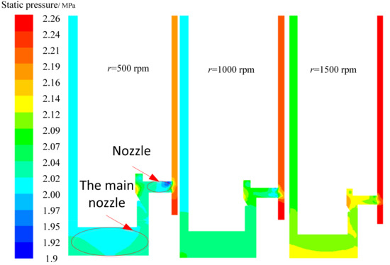 The rotational speed of the drill pipe is an important parameter that needs to be determined during the drilling process, which affects the flow-field noise at the drill bit and the scouring effect of the residual rock and sand. The static pressure, velocity, and noise distribution cloud diagrams of the middle section of the drill bit are shown in Figure 10, Figure 11 and Figure 12.