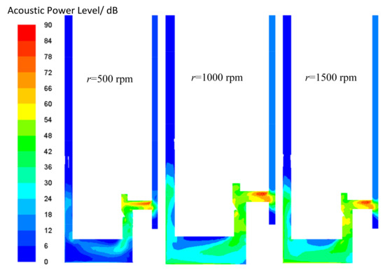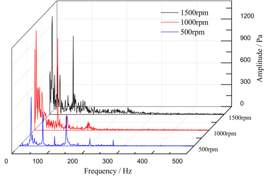 Figure 15 compares the flow-noise spectrograms when the drill rotational speed is from 500 to 1500 rpm. It can be seen that the distribution trend of the drill speed relative to the noise is the same, mainly in the low-frequency region between 0 and 200 Hz. At the same flow rate, the amplitude of the noise increases with increasing rotational speed and tends to be stable when the rotational speed is greater than 1000 rpm. Previous studies have shown that turbulent flow in a rotating circular tube tends to be laminar, which reduces the friction coefficient on the wall of the circular tube [39]. At the same time, the circumferential shear effect of the flow is enhanced [40]. The rotational effect of the pipe wall suppresses the axial turbulent pulsation but enhances the circumferential tumultuous vibration. The rotational effect significantly changes the correlation between near-wall turbulent pulses, and the transport capacity of turbulent pulsations decreases in the rotating state [41]. Due to the rotation of the drill bit, the flow of the flushing water is laminated, and the pulsation of the axial turbulent flow is suppressed. The transportation capacity of the tumultuous vibration is reduced, which makes the noise stable when the drill bit reaches a specific speed condition.