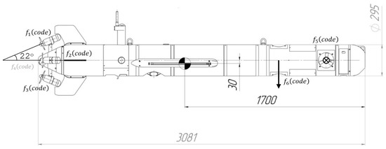 The propulsion–steering complex (PSC) is a program-controlled executive device. The AUV uses a propulsion system consisting of four aft reversible thrusters and two thrusters of horizontal and vertical channels. Stern thrusters are located in pairs in the horizontal and vertical planes at an angle of 22° to the longitudinal axis. This propulsion scheme makes it possible to create arbitrary forces and moments to control the AUV, as well as to implement various movement modes. The AUV motion is controlled by five degrees of freedom. The range of possible values for a given longitudinal velocity is 0–2.0 m/s.