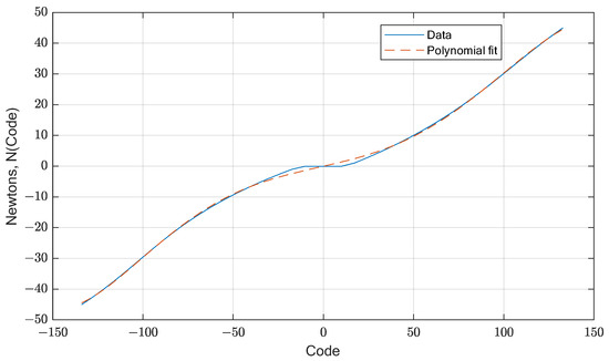 From the thruster’s static characteristic (Figure 5), it is possible to write down the functional dependence between the control code and the generated force, for example, by means of a sixth-order polynomial
