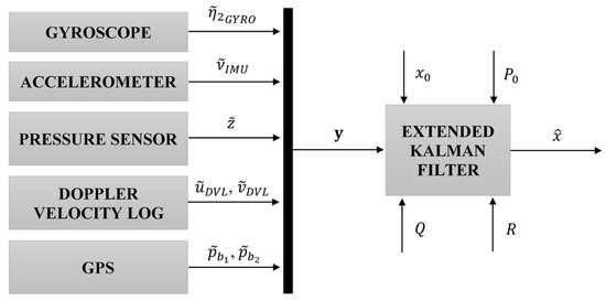Due to the complexity of the marine environment, a single navigation method cannot meet the requirements of high accuracy and stability [11,12]. Approaches to determining the positioning error of AUVs are defined in [8]. These approaches are based on the fact that the AUV navigation complex consists of a hydroacoustic and onboard system. The onboard navigation system may include an inertial measurement unit (IMU), a Doppler velocity logger (DVL), and a pressure sensor (PS) [13]. Moreover, GPS, DVL, and PS separately provide position, velocity, and depth information, which are used to correct the navigation data [13,14,15].