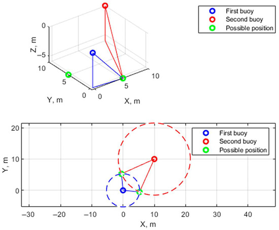 The beacons’ placement depends on the task conditions. Two or more beacons are placed at known locations, either as buoys on the water surface or moored on the seafloor. To increase the area of AUV operation, an approach in which surface vehicles are moved by mobile beacons for AUVs is proposed in [22,23,24]. A similar approach is proposed in the “Widely scalable Mobile Underwater Sonar Technology” project [25].