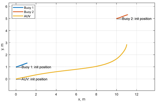 The hydroacoustic transceiver arrangement was based on [26], except for the existence of only two buoys. The studies [33,34] were used as a basis for mathematical modeling of the navigation system object dynamics (ANPA and buoys). Hydrodynamic parameters were determined using tabular data [35,36], and SDC-form [37] was used to represent all equations of dynamics and kinematics. The expressions presented in [38] were used to simulate the measurements of each sensor in the navigation system. The extended Kalman filter for state filtering was formed according to the general methodology presented in a number of sources [26,27,28,29,30]. The well-known maximum-ratio combining method was used as the considered method of sensor fusion.