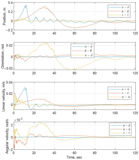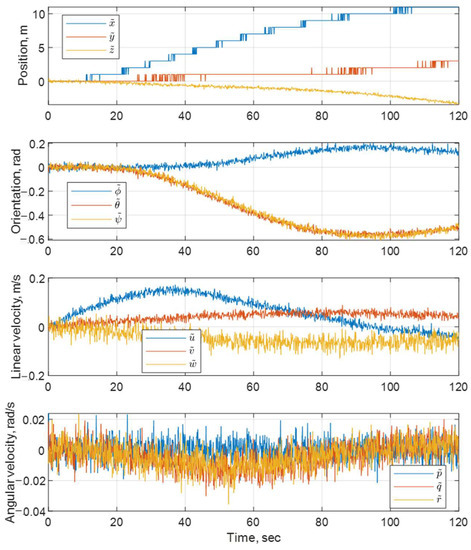 The presented position estimation graphs showed that the filtering of noisy data is fully realized. On the considered time interval, the error between the measured value and the actual value tends toward zero. The above judgment is supported by the numerical results of the given quality metrics. The finest results were obtained in restoring the velocities of the underwater vehicle.