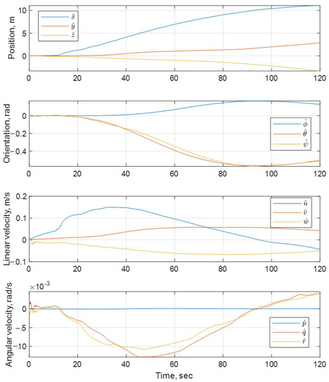 where determines the longitudinal, lateral, and vertical positions, respectively, and the vector determines the Euler angles of roll, pitch, and yaw, respectively.