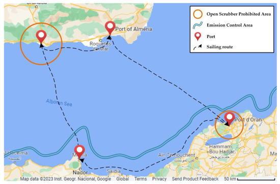 In the third scenario (r = 3), compliance with constraints (26)–(31) is essential within the restricted area of open scrubber operation. Constraints (26)–(29) show that without a closed scrubber, fuel containing over 0.5% sulfur cannot be adopted. Constraints (30) and (31) indicate that when a closed scrubber is installed but not utilized, the sulfur content of the fuel must also be restricted to 0.5% or lower. However, when a closed scrubber is installed and actively utilized, there are no limitations on fuel selection.