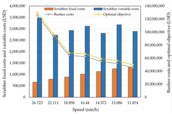 Considering the delivery time and other requirements, the sailing speed of ships deployed on the route might change. In this subsection, numerical experiments with different ship speeds are conducted. The number of ships is adjusted using constraint (45) based on the new speed. For newly introduced ships, their fuel consumption rate during sailing and berthing is generated based on the settings mentioned in Section 4.1. Furthermore, the upper bound of total installation costs () is adjusted proportionally, taking into account the basic scenario with eight ships. Moreover, when calculating the objective function, a coefficient is multiplied to preserve the planning period.