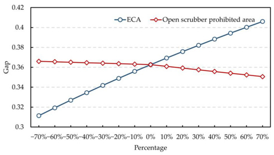 The results presented in Table 12 and Table 13 are determined by adopting modified sailing distances for the third and fourth emission regulation scenarios, namely voyage length in the OSPAs. It is evident the percentage of the OSPA has an opposite impact to that of the SECAs but in a minor way. The expansion of OSPAs does not affect the utilization of the closed scrubber and the operation of ships without scrubber. Only ships equipped with an open scrubber will incur cost increases, as they are restricted to using LSFOs in OSPAs. Meanwhile, since the open scrubber makes up only 14% of all scrubber installations in the basic case and closed scrubbers are expensive to install, the impact is not as significant as that of SECAs, as shown in Figure 3. The figure shows how the gap between the optimal costs with and without considering scrubbers varies with the percentage of SECAs and OSPAs along the whole route. It is indicated that with the increase in OSPAs, the gap will narrow due to the restriction on the usage of open scrubbers. Meanwhile, the gap expands more significantly with SECAs because SECAs will influence the operation of all deployed ships. Therefore, with the growing tendency of SECAs and OSPAs, our model will still be effective in the future and become helpful to shipping companies. When all ports set OSPAs, this problem will still be worth investigating because open scrubbers can be used on international waters.