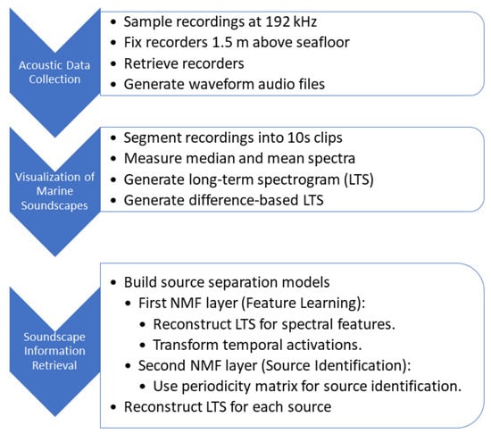 Zha et al. introduced a reinforcement learning-based path-planning algorithm designed to enable the safe and efficient navigation of ships in wind farm areas [11]. Through a series of simulations, they demonstrated the effectiveness of the proposed hybrid path-planning method, which combines A* and reinforcement learning. This approach successfully generated a feasible path-planning scheme for navigating through wind farm waters, even in the presence of obstacles. In a research study conducted by Lin et al., an unsupervised learning model was developed to discern various sound sources underwater [12]. This model was applied to analyze long-term underwater recordings collected near Phase I of the Formosa I wind farm, situated off the coast of Taiwan. The researchers aimed to assess the temporal, spatial, and spectral variabilities present in these recordings. To achieve this, the authors employed the periodicity-coded non-negative matrix factorization method, an unsupervised learning technique used for decomposing high-dimensional data into non-negative components. Figure 1 illustrates the general procedure adopted for their proposed approach. The significance of this research lies in its potential to evaluate the impact of noise-generating activities on soniferous marine animals and their acoustic behavior before, during, and after the construction of offshore wind farms. Additionally, the study provides an efficient tool for building an annotated database, facilitating further investigations in this domain.