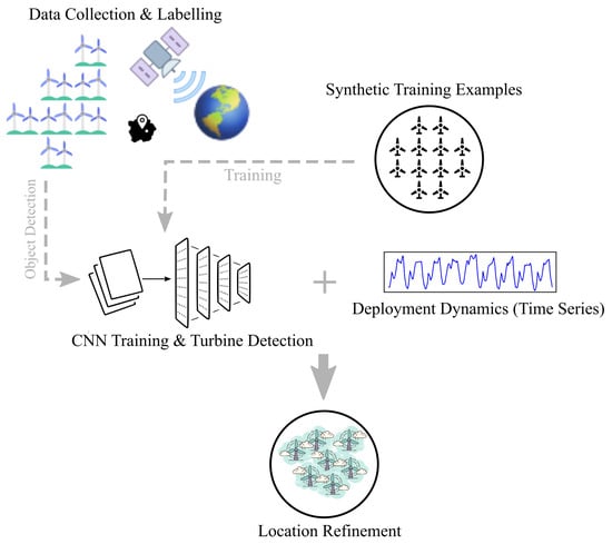 Hoeser et al. introduced the DeepOWT dataset (Deep-learning-derived Offshore Wind Turbines), which encompasses 9941 global offshore wind energy infrastructure locations, along with their corresponding deployment stages [18]. DeepOWT harnesses publicly accessible Earth observation data derived from the Sentinel-1 radar mission. The identification of offshore wind infrastructure locations was accomplished through a two-step process that employed deep learning-based object detection. Figure 2 shows the general procedure used for developing the dataset. The authors highlighted that with the availability of this free and accessible data, it becomes more likely that all stakeholders operating within marine and coastal environments will participate in the expansion of offshore wind farms. In another study, Hoeser et al. proposed “SyntEO”, an approach to facilitate the automated creation of substantial deep learning-compatible datasets for Earth observation research [19]. The SyntEO methodology’s application was exemplified in the context of identifying offshore wind farms within Sentinel-1 satellite images. The operational implementation involved the construction of an expansive dataset, encompassing approximately 90,000 training instances. A rudimentary CNN, exclusively trained on synthetic data, exhibits the capability to adeptly discern offshore wind farm installations within the images.