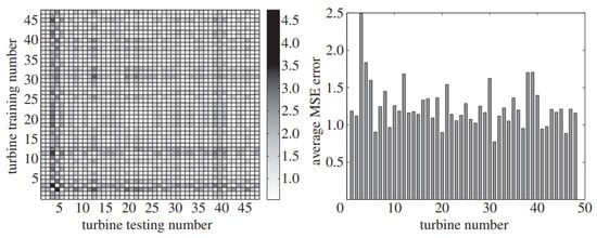 Confusion matrix depicting MSE errors on the testing set [left] and average MSE errors illustrating the predictive performance of each turbine (power produced) [right] [32].