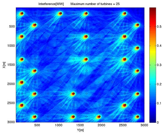 Visualizing the wave effect for the landscape of a wind farm. The nodes represent turbines, whereas the backdrop hues illustrate the degree of interference as per Jensen’s model [36].