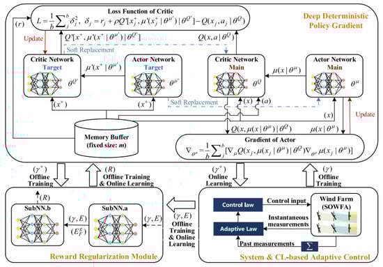 Dong et al. developed a deep reinforcement learning-based wind farm control scheme to optimize power generation in wind farms [53]. They designed a reward regularization module to estimate wind turbines’ normalized power outputs under various yaw settings and uncertain wind conditions, enhancing the control scheme’s robustness and adaptability. The reward regularization module was integrated with the deep deterministic policy gradient algorithm to identify the optimal yaw settings for all wind turbines in the farm. Figure 6 shows the general framework for the proposed approach. The model was trained and validated using high-fidelity simulations with SOWFA [54] (a simulator for offshore wind farm applications) and Tensorflow [55]. They collected 90 sets of 1000 s large-eddy simulations with SOWFA to generate offline training data for their reinforcement learning. The proposed method significantly improved the wind farm’s total power production by an average of 15% compared to the benchmark.
