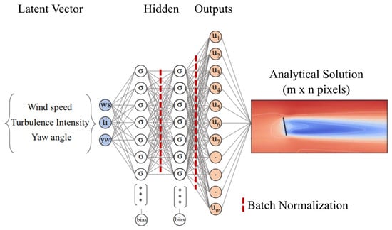 Anagnostopoulos and Piggott developed a wind farm flow field modeling framework using an MLP architecture [64]. Their model was trained on approximated turbine wake fields from FLORIS [65] wind farm software (v2.1.1). With a minimum of two hidden layers, each comprising 100 neurons, the MLP generated an m by n grid depicting the downstream velocity domain of the wake. Figure 7 shows a general overview of the model. This approach rapidly simulated a 5 MW wind turbine with yaw variations and diverse inlet hub speeds and turbulence intensities. The simulation outpaced analytical wake-based solutions by an order of magnitude while maintaining just a 1.5% mean absolute error. The model’s yaw optimization feature exhibited remarkable efficiency as well. The MLP-derived optimal yaw settings produced power outputs comparable to FLORIS’ optimization module, achieving this at a speed ten times faster.