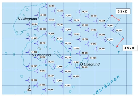 The layout of Lillgrund Wind Farm used for numerical simulations of the farm discussed in [88]. This information was obtained from the Lillgrund Wind Farm, owned and operated by Vattenfall [90].