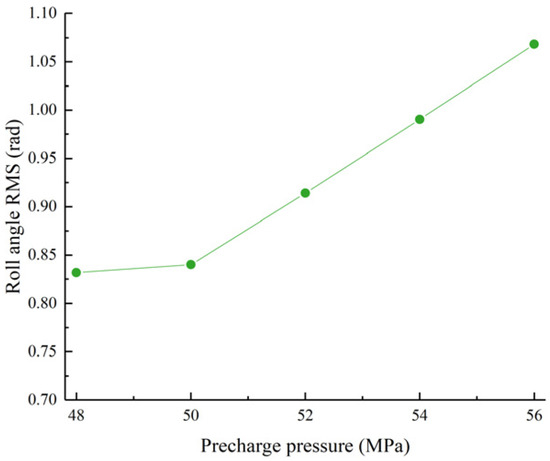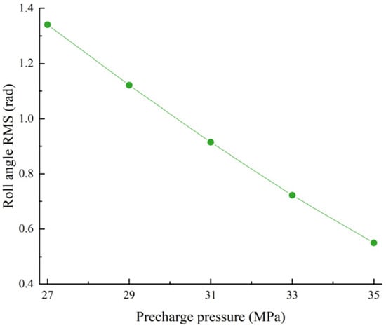 Roll angle RMS value as a function of the left accumulator pre-charge pressure.